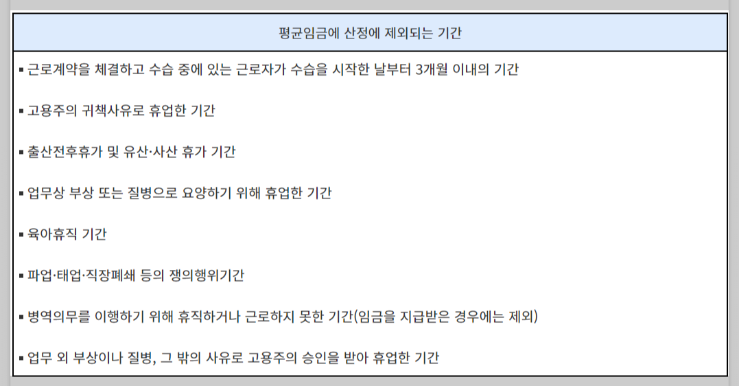 - 기본급, 성과연봉, 기타 직무와 관련된 모든 수당은 평균 임금에 포함