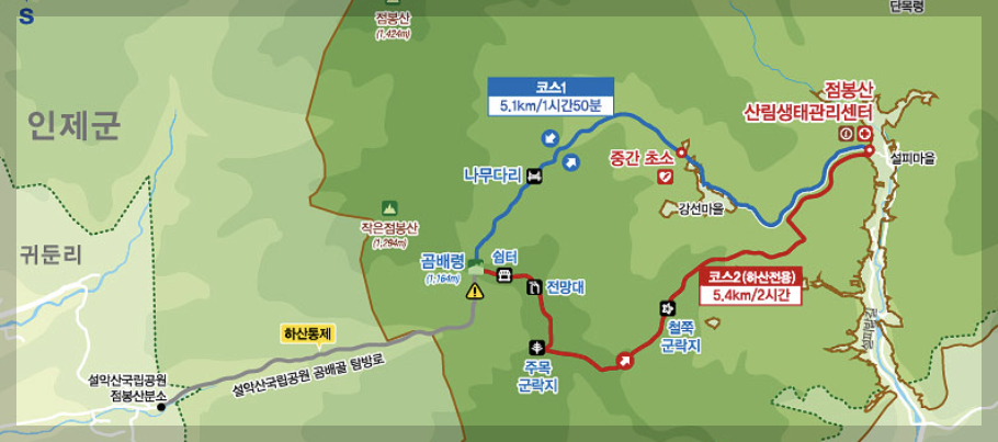 산림청에서 관리하는 강선리 코스는 점봉산 생태관리센터에서 시작해 강선마을을 거쳐서 곰배령까지 올라가는 코스는 10km로 약 4시간이 소요되는 코스입니다. 위의 지도에서 코스 1에 해당되는 코스로 코스1으로 곰배령까지 올라갔다가 코스2로 내려오는 원점회귀 코스입니다.