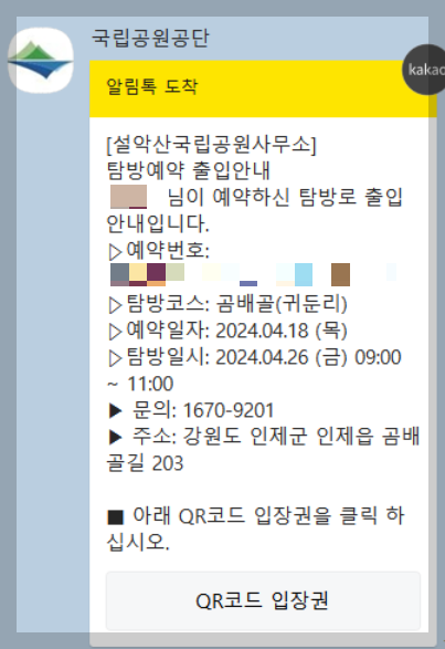 예약이 완료되면 카카오톡으로 예약 알림톡이 도착하며 당일 알림톡 하단의 QR코드 입장권을 이용해 탐방을 시작하시면 됩니다.