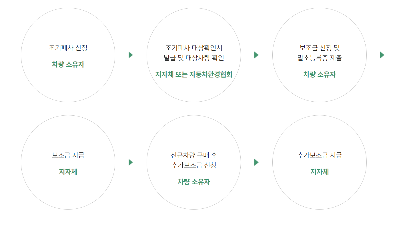 - 오프라인 : 소유자가 구비서류 첨부하여 지자체나 협회에 노후차량 조기폐차 보조금 지급대상 확인 신청서를 제출