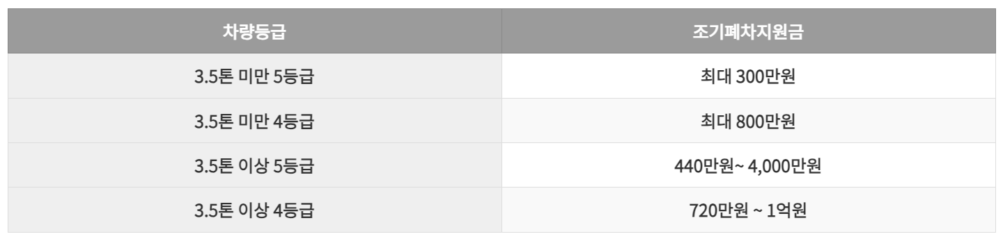 배출가스 등급과 차량 종류에 따라 조기폐차 지원금은 다르게 적용이 됩니다. 폐차시 지원받는 기본지원금을 지급받게 되며 폐차 후 친환경 차량을 구매할 경우 추가지원금을 지급받게 됩니다.
