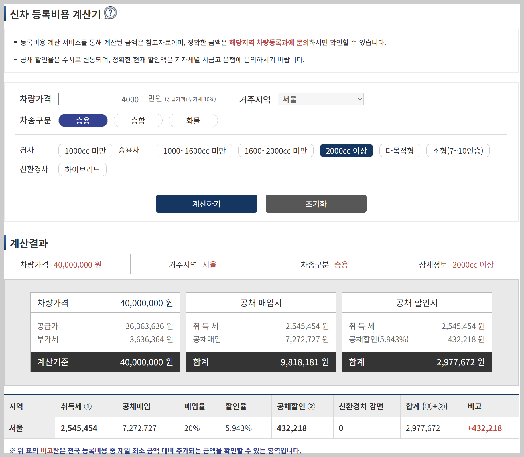 계산기에서는 취득세, 등록세, 공채 매입비, 번호판 교체비 등 모든 비용을 한눈에 확인할 수 있어 매우 편리합니다.