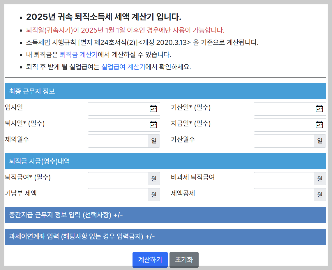 이 모든 과정이 자동 계산기에 내장되어 있어, 복잡한 세법을 몰라도 누구나 정확한 퇴직소득세를 예측할 수 있습니다.