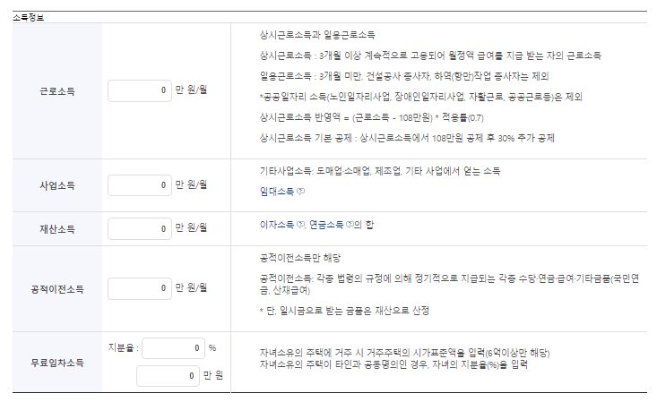 소득인정액은 아래의 근로소득과 사업소득, 재산소득, 공적이전소득, 임차소득 등의 항목을 월 소득평가액으로 계산하고 환산하게 됩니다. 이를 선정기준액과 비교하여 이하인 경우 수급 대상자가 됩니다.