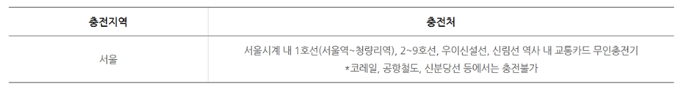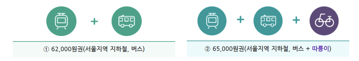 충전은 현금으로만 가능하며 2가지 권종이 있습니다. 버스와 지하철 따릉이를 모두 이용가능한 65,000원과 지하철과 버스만 이용가능한 62,000원권 2가지입니다.