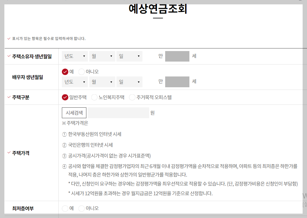 주택가격은 가입당시를 기준으로 아파트는 한국부동산원, KB국민은행 시세 순으로 가격을 적용하고, 아파트 이외 시세 없는 주택 및 오피스텔은 감정평가를 통해 시세를 적용합니다.