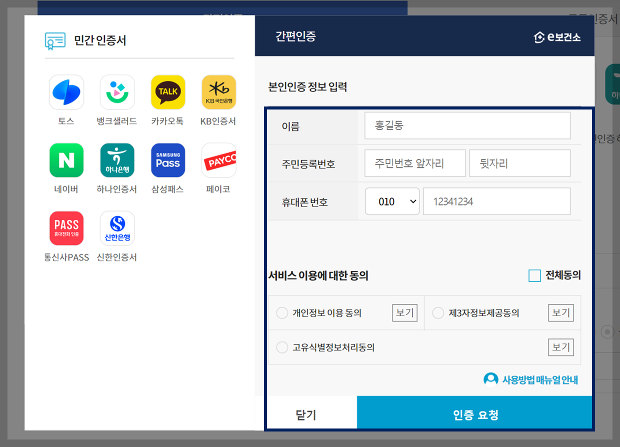 먼저 e보건소 홈페이지로 이동하여 민원서비스를 클릭합니다. 개인정보 수집 동의 서류에 동의 하신 후 간편인증, 공인인증서, 디지털패스를 이용한 본인인증을 거쳐야합니다.