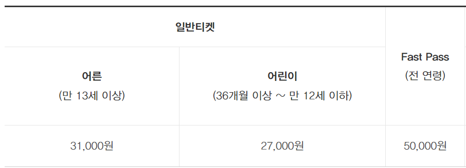 Fast Pass 티켓은 50,000원으로 전 연령 요금이 동일하게 적용되며 방문 당일 현장 매표소에서만 구입 가능합니다.