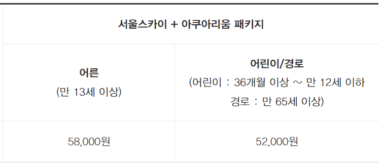 롯데타워에서는 전망대뿐만 아니라 아쿠아리움도 함께 방문하실 수 있습니다. 패키지 티켓은 어른 58,000원 어린이/경로는 52,000원에 구매 가능합니다.