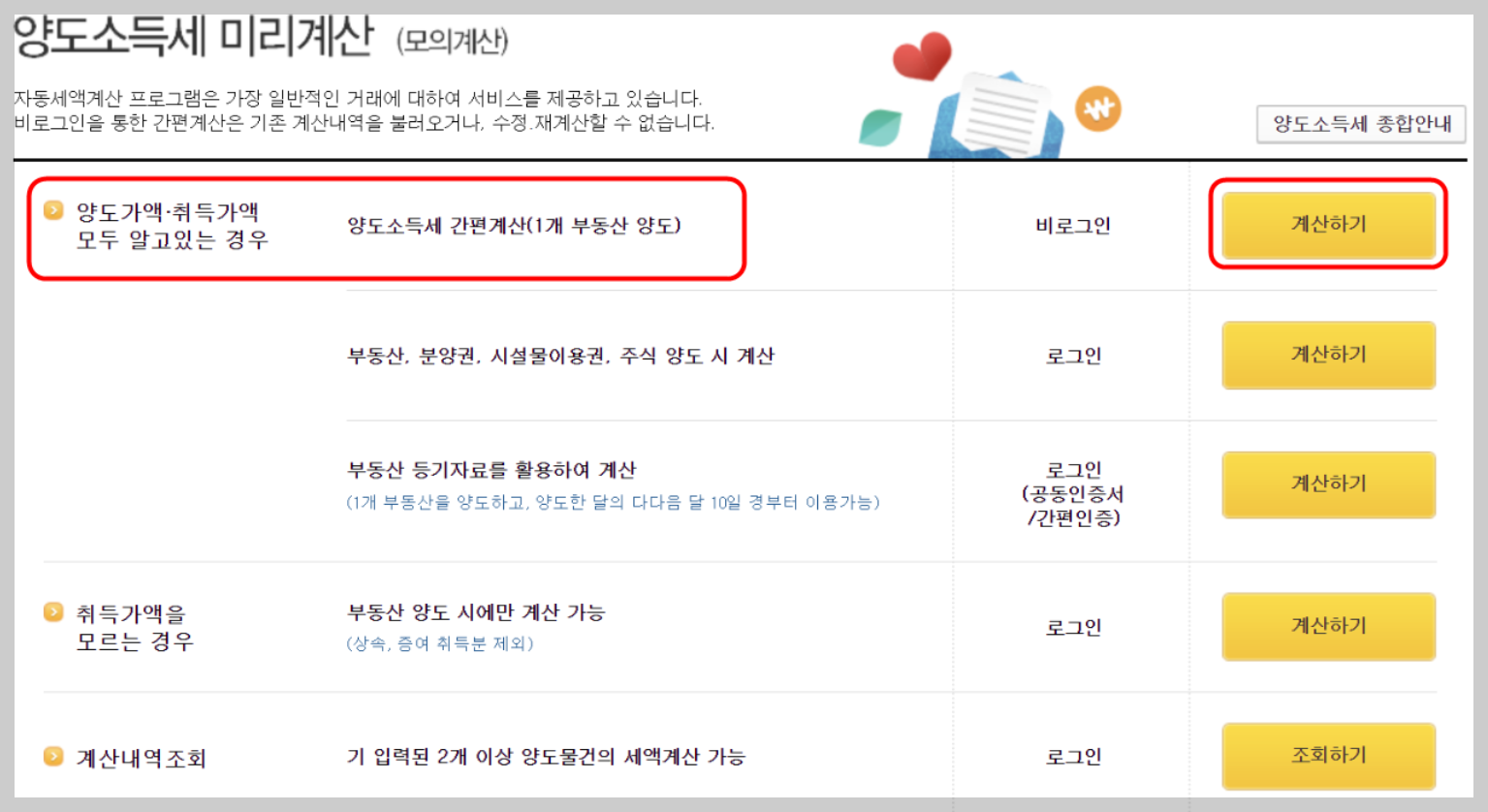 홈택스 양도소득세 계산기는 홈택스> 세금신고> 양도소득세 신고> 모의계산으로 접속하시면 로그인하지 않아도 바로 모의계산이 가능합니다.