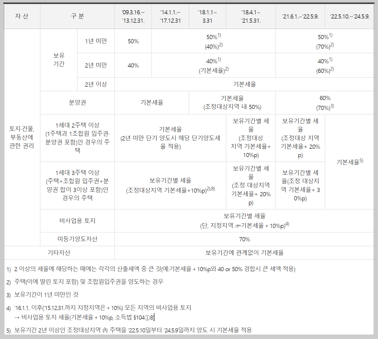 주택 및 조합원입주권을 양도하는 경우에는 1년미만 70%, 2년 미만 60%, 2년 이상은 기본세율을 적용합니다.