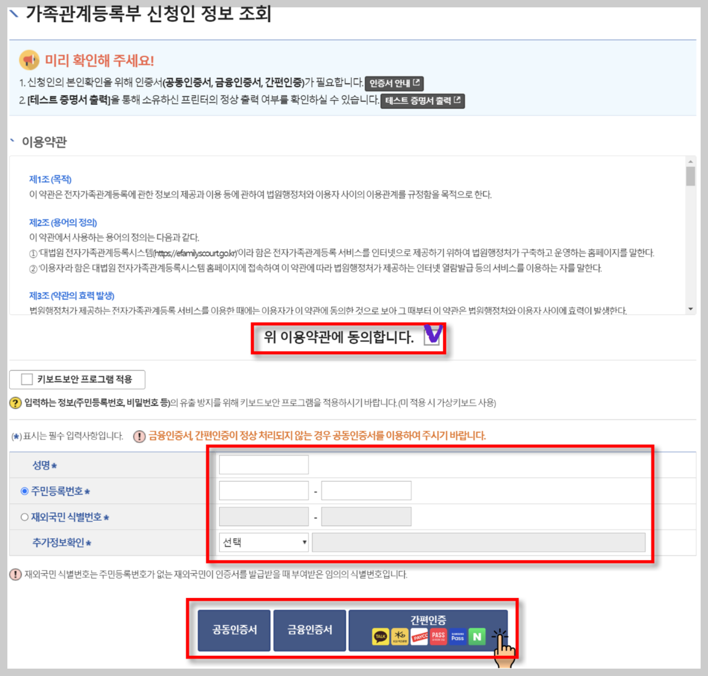약관에 동의합니다를 클릭하시고, 하단에 성명, 주민등록번호와 추가정보확인를 입력하면됩니다. 그 후에 공동인증서나 금융인증서, 간편인증서를 이용하여 로그인합니다.