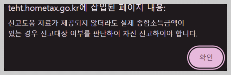 신고 대상인지 확인하는 방법은 홈택스 사이트에서 개인정보 입력 후 바로 확인을 할 수 있습니다.