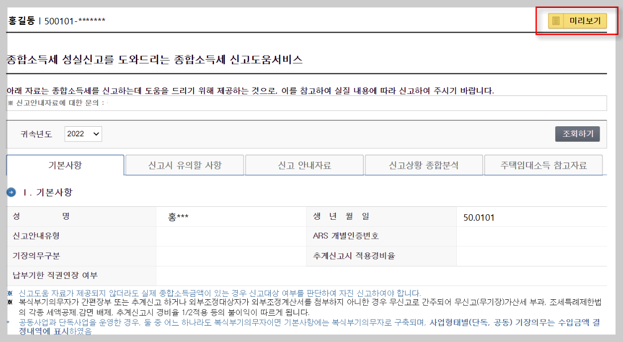 상단의 미리 보기 노란 버튼을 클릭하면 종합소득세 신고 안내 정보가 뜨게 됩니다. 각 사업장별 수입금액과 이자, 배당, 근로, 연금 소득이 있다면 아래에 각각 입력되어 나옵니다.