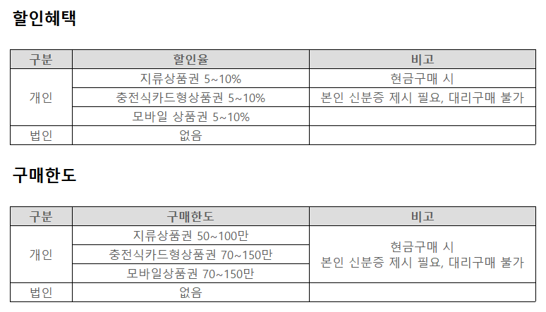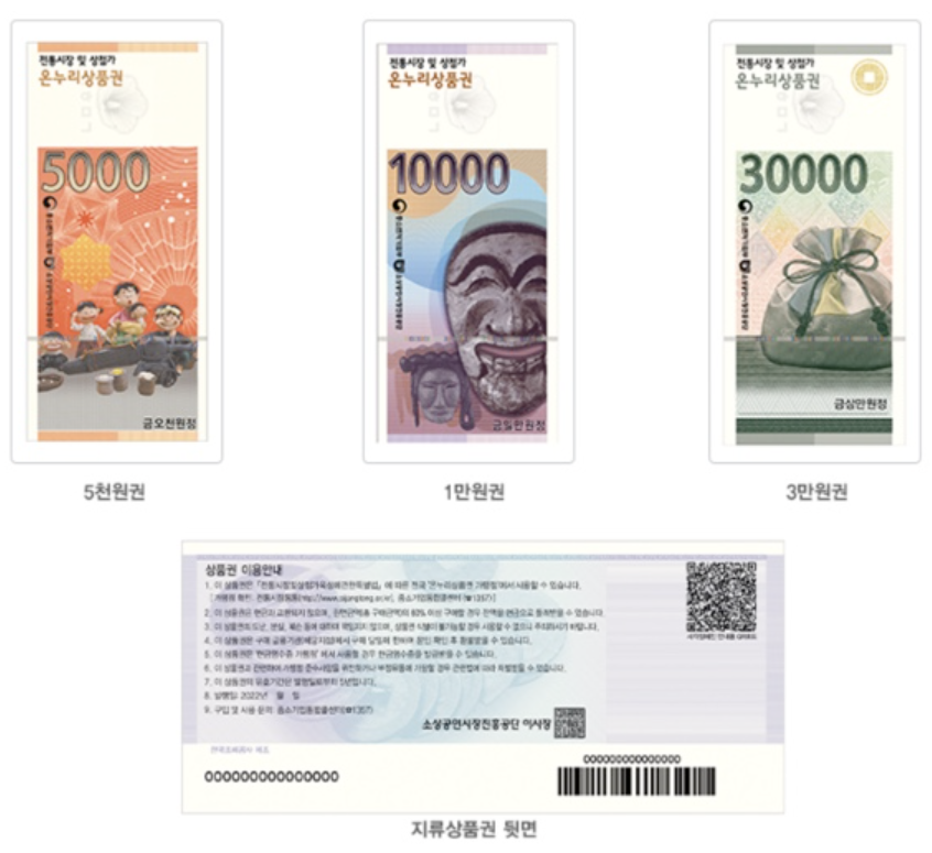권종은 5천원, 1만 원, 3만 원 3가지이며, 상품권 결제 시 현금영수증 처리가 가능합니다. 상품권 금액의 60% 이상 구매했을 경우 잔액은 현금으로 받을 수 있습니다.